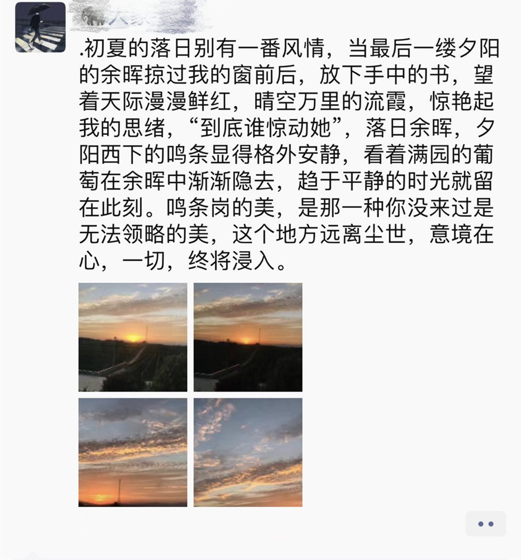夏日的晚霞別有一番風情,當最后一縷夕陽的余暉掠過窗前,放下手中的書,望著天際漫漫鮮紅,晴空萬里的流霞,驚艷起我的思緒,“到底誰驚動了她”,落日余暉,夕陽西下的鳴條顯得格外安靜,看著滿園的葡萄在晚霞中漸漸隱去,趨于平靜的時光就留在此刻。鳴條崗的美,是那一種你沒來過是無法領略的美,這個地方遠離塵世,意境在心,一切,終將浸入。