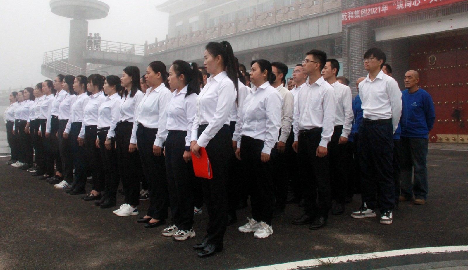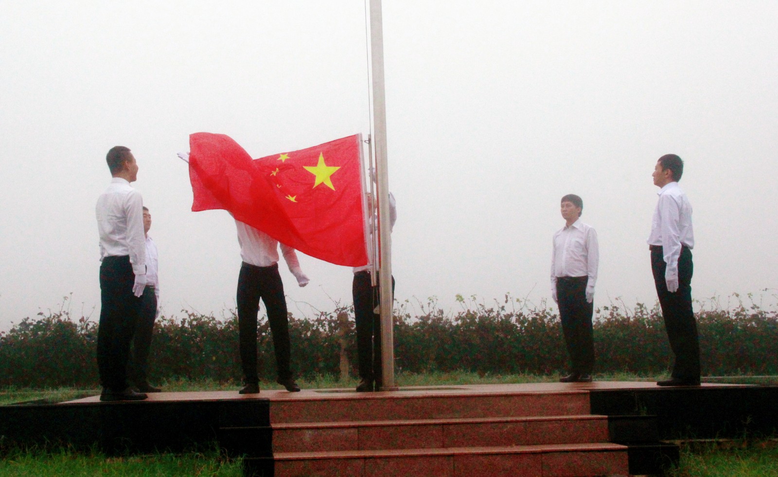 全體員工統(tǒng)一著裝、整齊列隊,面對國旗肅立,行注目禮,伴隨著雄壯激昂的《義勇軍進行曲》,鮮艷的五星紅旗冉冉升起。
